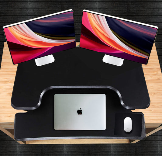 experience. The Desk Converter provides a unique design to support ergonomic sit and stand up work positions. With the space efficient two-tiers design, you will have better organization of your work area and plenty of room to spread out!